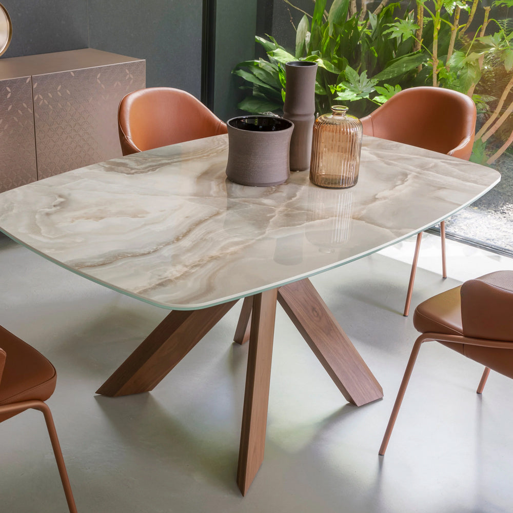 The Cecilia Dining Table blends natural warmth with modern elegance, making it a refined centerpiece for any dining space. Its smooth ceramic top, available in stunning finishes Onice Noir, Onice Beige and Calacatta White Opaco Matte, offers a sophisticated surface that is both stylish and highly durable.