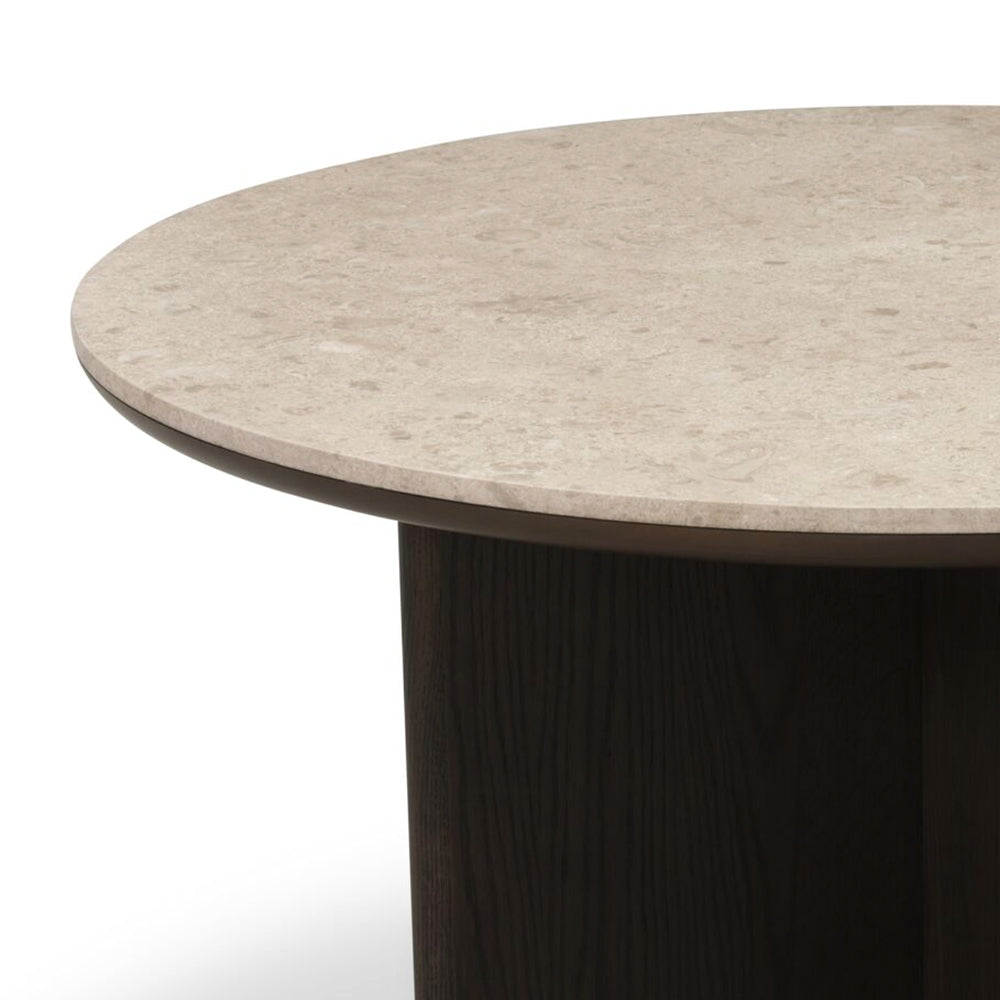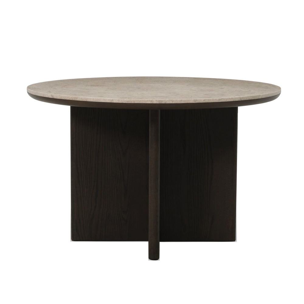 The Alfi dining table features a contemporary design language with a smoked oak veneer base and a solid Bursa marble top.