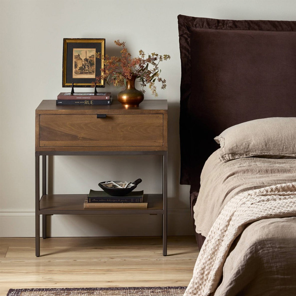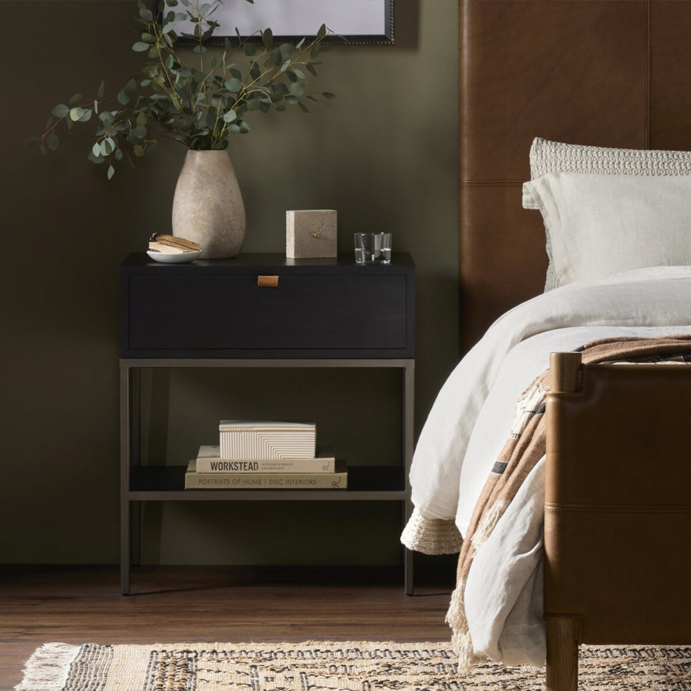 Inspired by clean mid-century design, a stylish nightstand of solid poplar brings extra space to bedside storage. Metal-secured leather pull adds a textural element of surprise. Pairs great with other pieces in the Davis Collection.